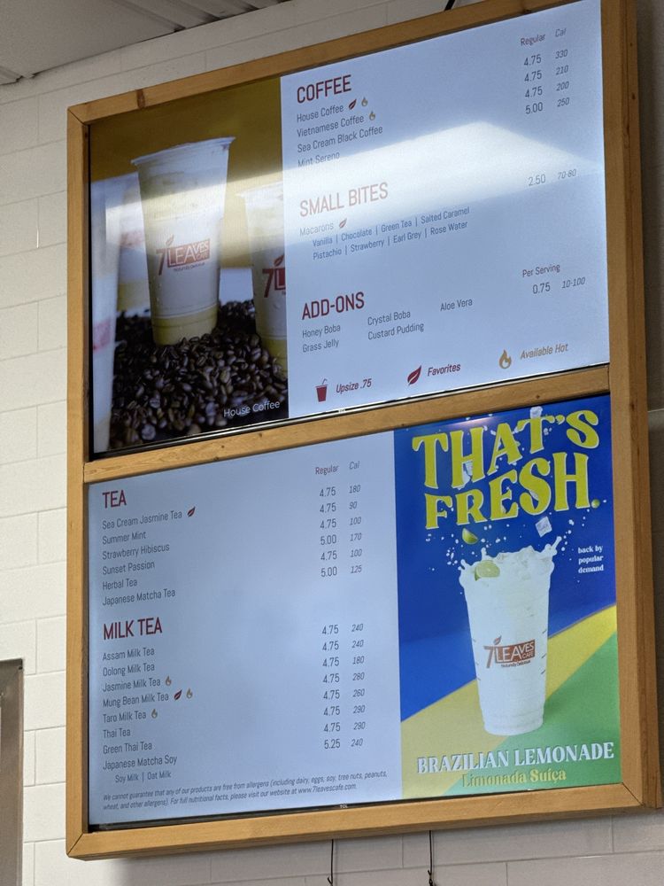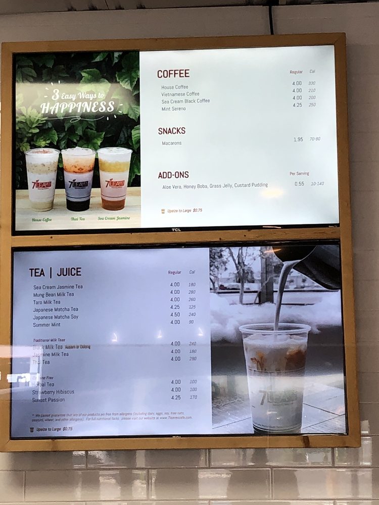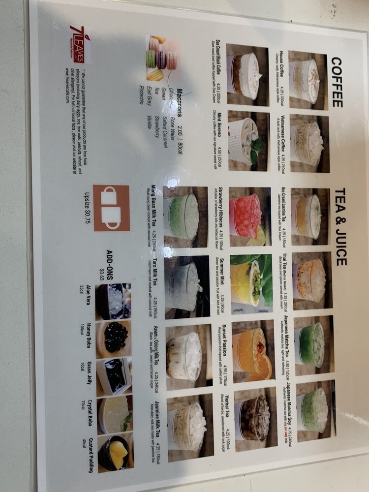 “ Ive been to 7 Leaves about half a dozen times and Ive had great service every time. On my first visit precovid, they let me taste their teas and house coffee. I usually get the house coffee with the salt cream top and I highly recommend it, but it was later in the day so I had the jasmine tea with salt cream too it was refreshing and not too filling. I also really like the taro tea, but it can be a bit filling. I love taro because its not too sweet but still like a dessert. They usually have several flavors of macaroons but they only had a few options on my most recent visit around 430 pm. They dont have a huge menu which is nice because sometimes tea places can have really overwhelming menus. Parking is a bit hard in this plaza but not 7 Leaves fault. ”